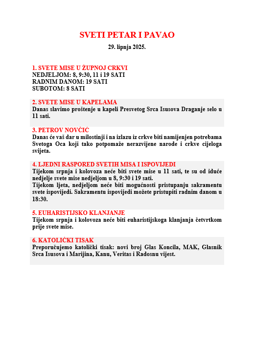 OBAVIJESTI NEDJELJE SV. PETRA I PAVLA, 29. lipnja 2025.
